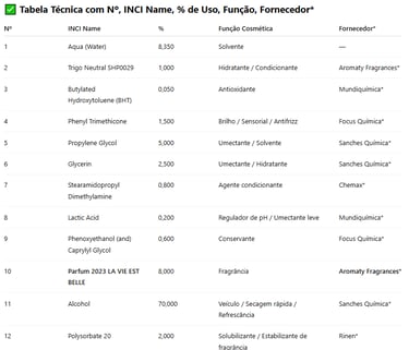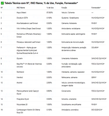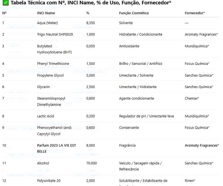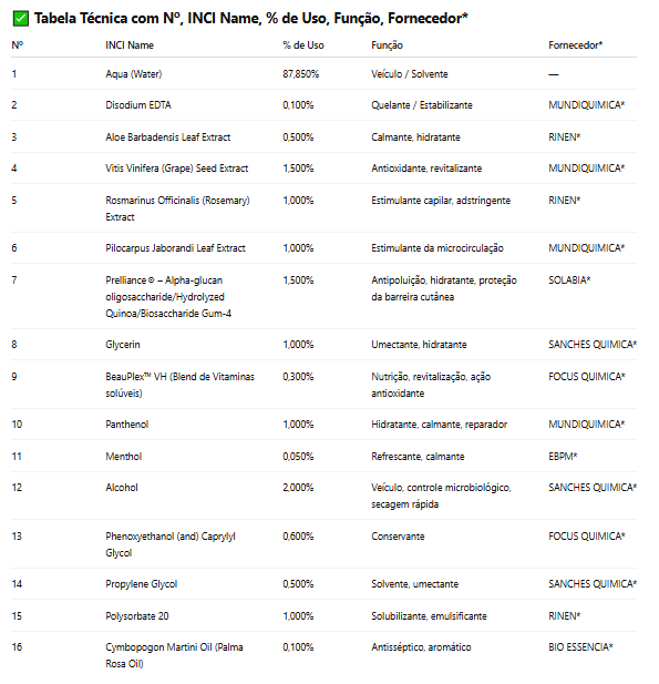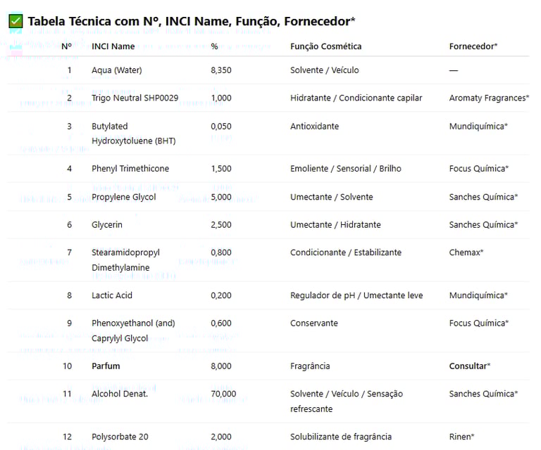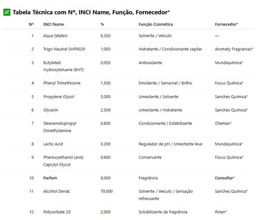 * Os fornecedores citados acima são indicativos e baseados nas matérias-primas originalmente utilizadas. As empresas fornecedoras não possuem qualquer responsabilidade sobre a fórmula final, seu desempenho, segurança, comercialização ou adequação regulatória. Toda responsabilidade técnica, legal e operacional referente ao desenvolvimento, manipulação, testes e aplicação da formulação recai exclusivamente sobre o formulador e/ou empresa desenvolvedora do produto.